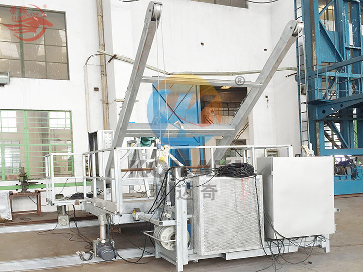 5、上升安全限位装置:旋转吊臂两端和辅吊滑轮组上安装了上升限位开关,当吊船和辅助吊重上升触动限位开关时,吊船和辅助吊重将停止上升并发出报警音。